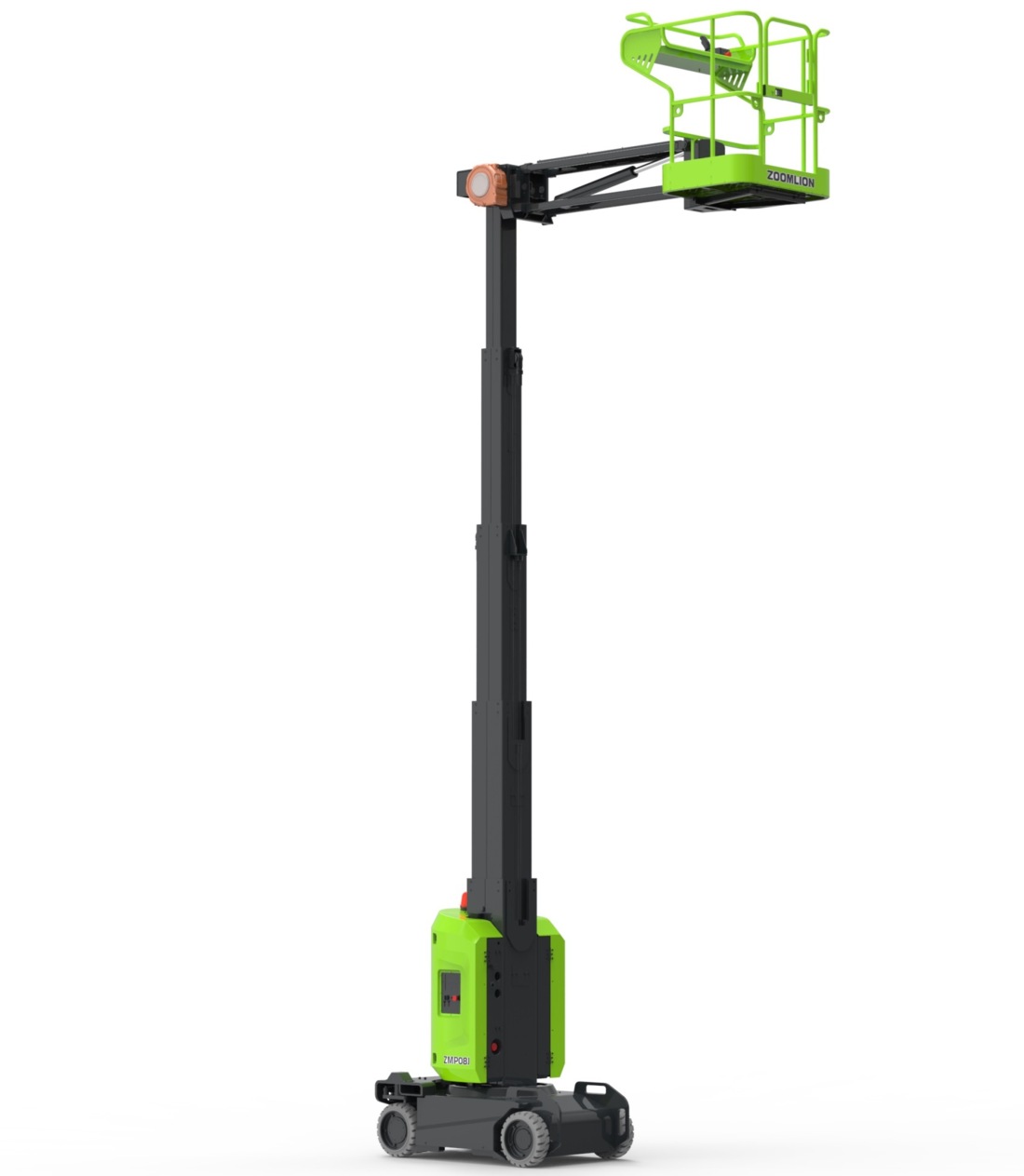 Zoomlion has launched three new models with mast elevation mechanisms, two mast booms, the 10 metre ZMP08J and 11.2 metre ZMP09J, and a mast type lift, the 20 ft ZMP06G. All three feature AC direct drive electric motors and maintenance free batteries