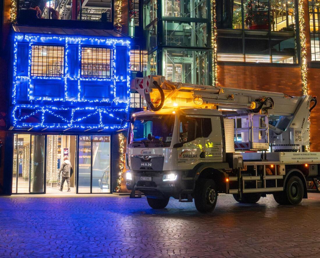 Polish rental company Śmielak has used its new 37.5 metre Multitel MJ 375 truck mounted platform to install and then decorate a large Christmas tree at a shopping centre in Warsaw, along with a number of large decorative light installations on the building.