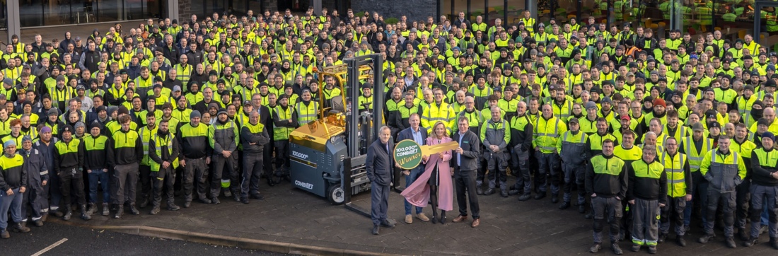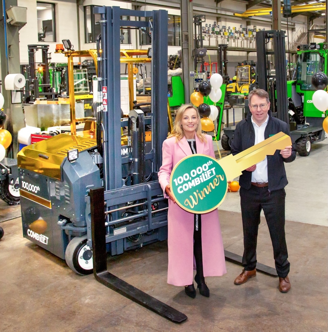 To commemorate the milestone, Combilift launched a competition, offering the 100,000th three tonne Combi-CBE multidirectional forklift in golden coloured livery as the prize. The campaign generated €56,500 in ticket sales, with Combilift topping up the total to €100,000.