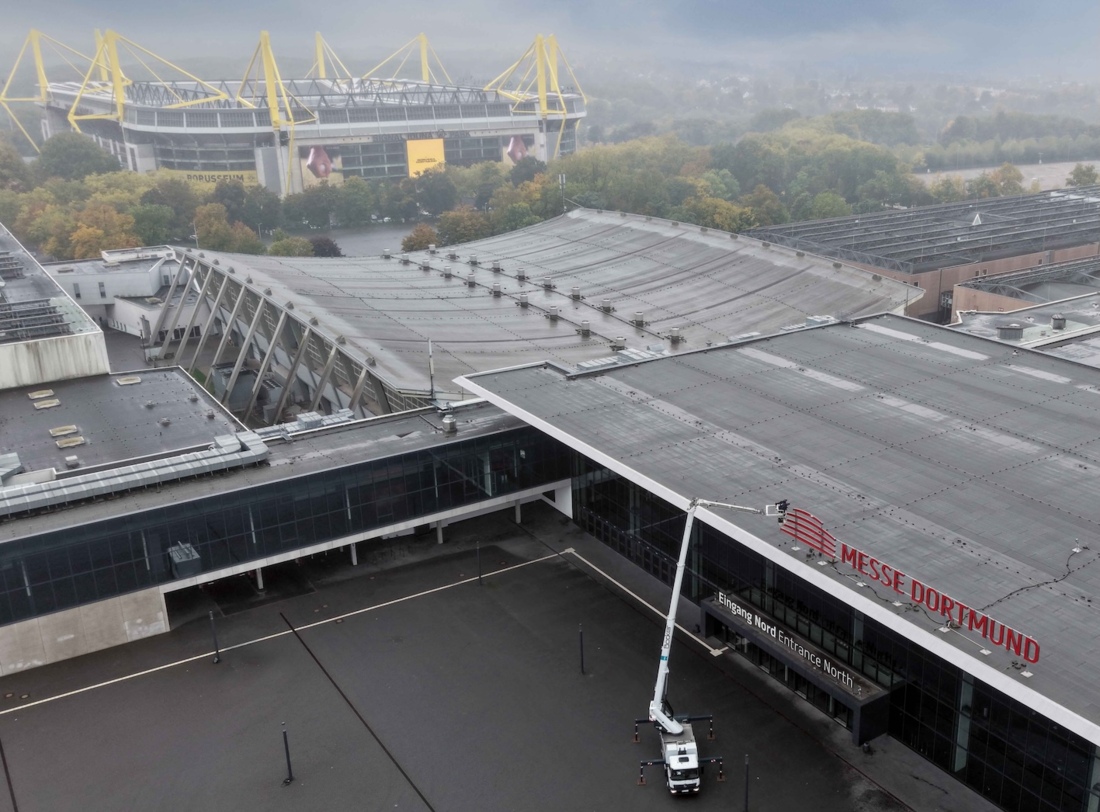 German roofing contractor Bedachungen Sindermann has deployed a four tonne AK 36 and a six tonne AK 48 Böcker truck mounted crane for roof renovation work at Westfalenhalle, a large events arena in Dortmund.