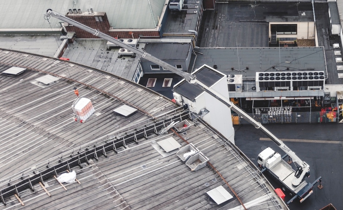 Bedachungen Sindermann is overseeing the replacement of the upper ring roofing below the dome with the cranes assisting with the renewal of the venue’s distinctive dome, following earlier repairs to storm damage in 2024.