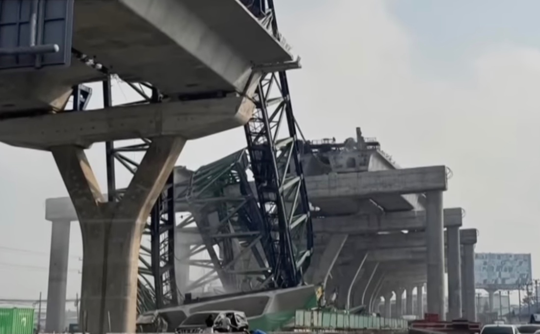 Just 24 hours after the fatal launching crane collapse onto a train in Nakhon Ratchasima, another launching crane collapsed today onto a busy road in a coastal suburb south of Bangkok, killing two people.
