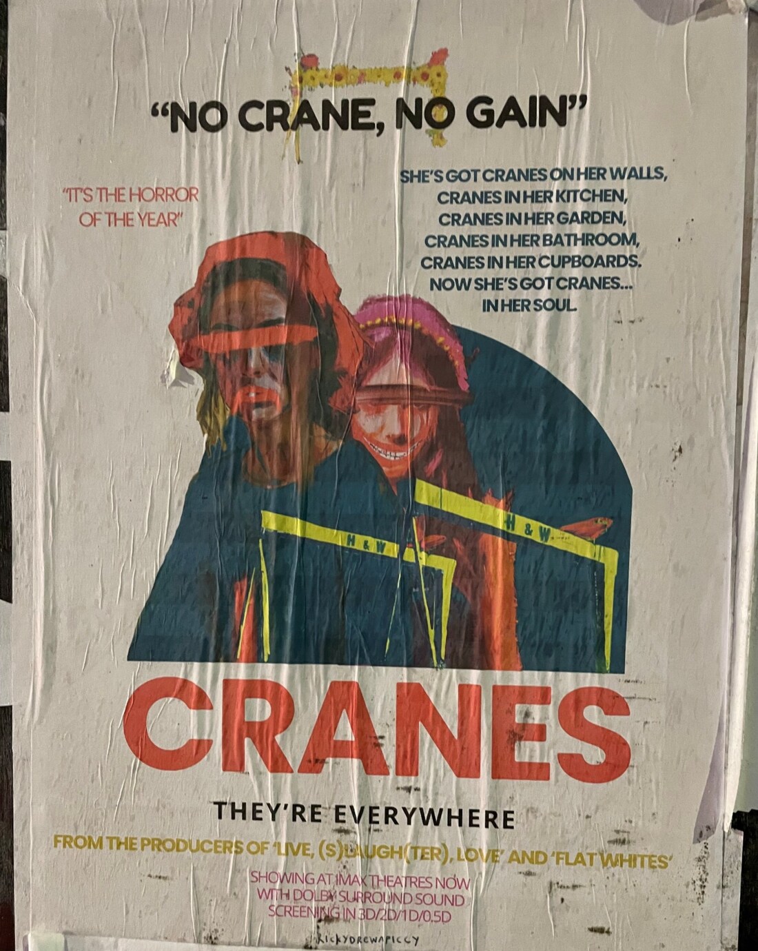 The posters are clearly connected to Harland & Wolff’s two giant 850 tonne Krupp gantry cranes known as Samson and Goliath. Goliath was erected in 1969, and Samson in 1974. Goliath is 96 metres high, while Samson is 106 metres. Each crane has a span of 140 metres and can lift loads to a height of 70 metres. They have a tandem lift capacity of almost 1,700 tonnes.