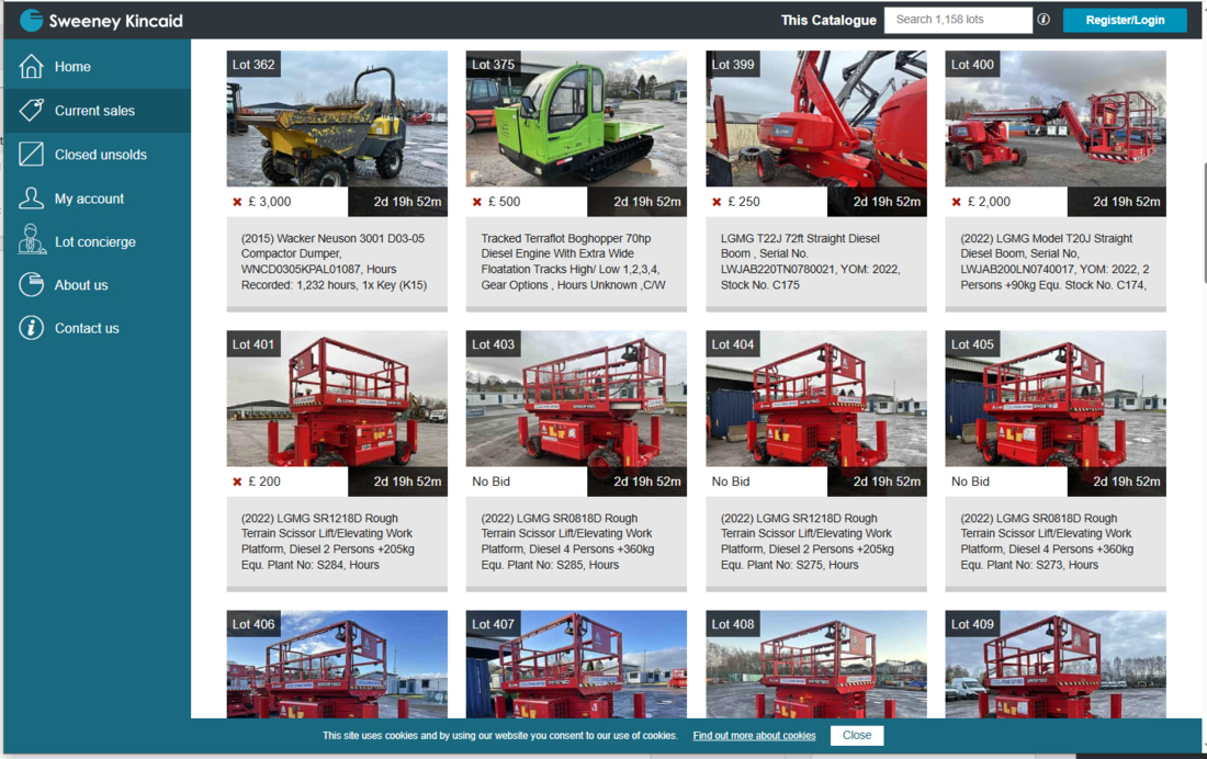 The sale, which closes on Thursday this week, includes a range of booms, scissor lifts, and spider lifts from LGMG, Snorkel and Hinowa, along with scaffold towers and a wide range of tools and small equipment.