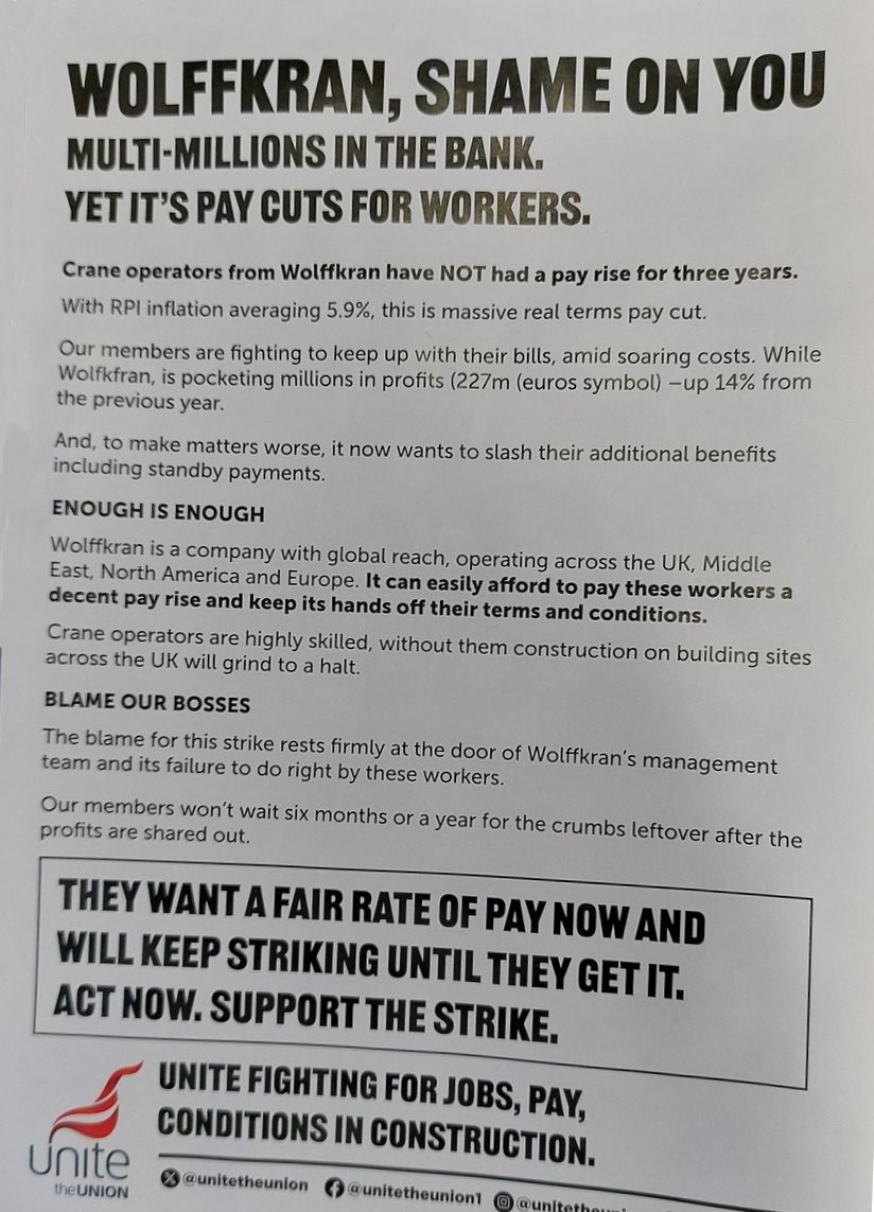 A few pickets are standing outside some of the construction sites where Wolffkran tower cranes are located, with some of them brandishing Unite posters like the one below.