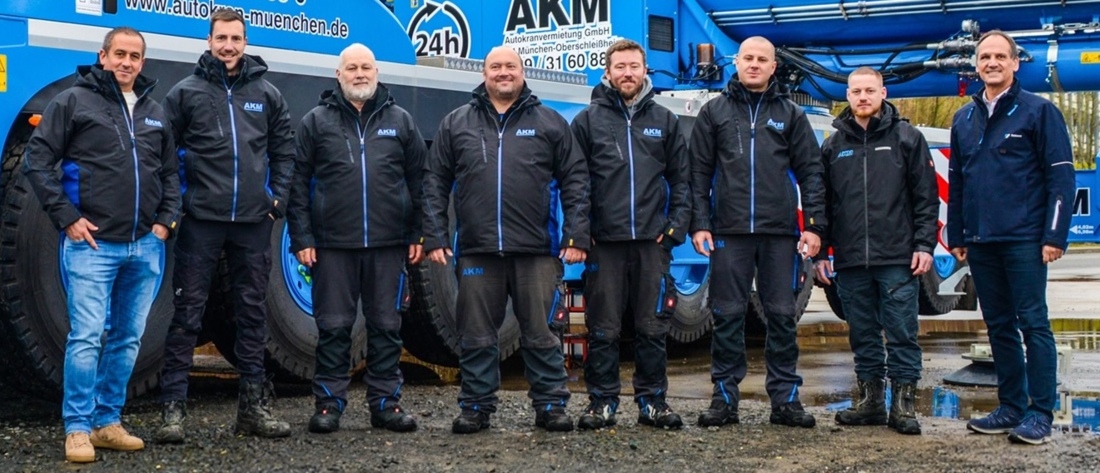 (L-R) Sven Bauer, Christian Lippert, Klaus Kellner, Hermann Schulz, Florian Regenhardt, Damian Wegrzyn and Justin Herzog of AKM with Hans Asam of Tadano