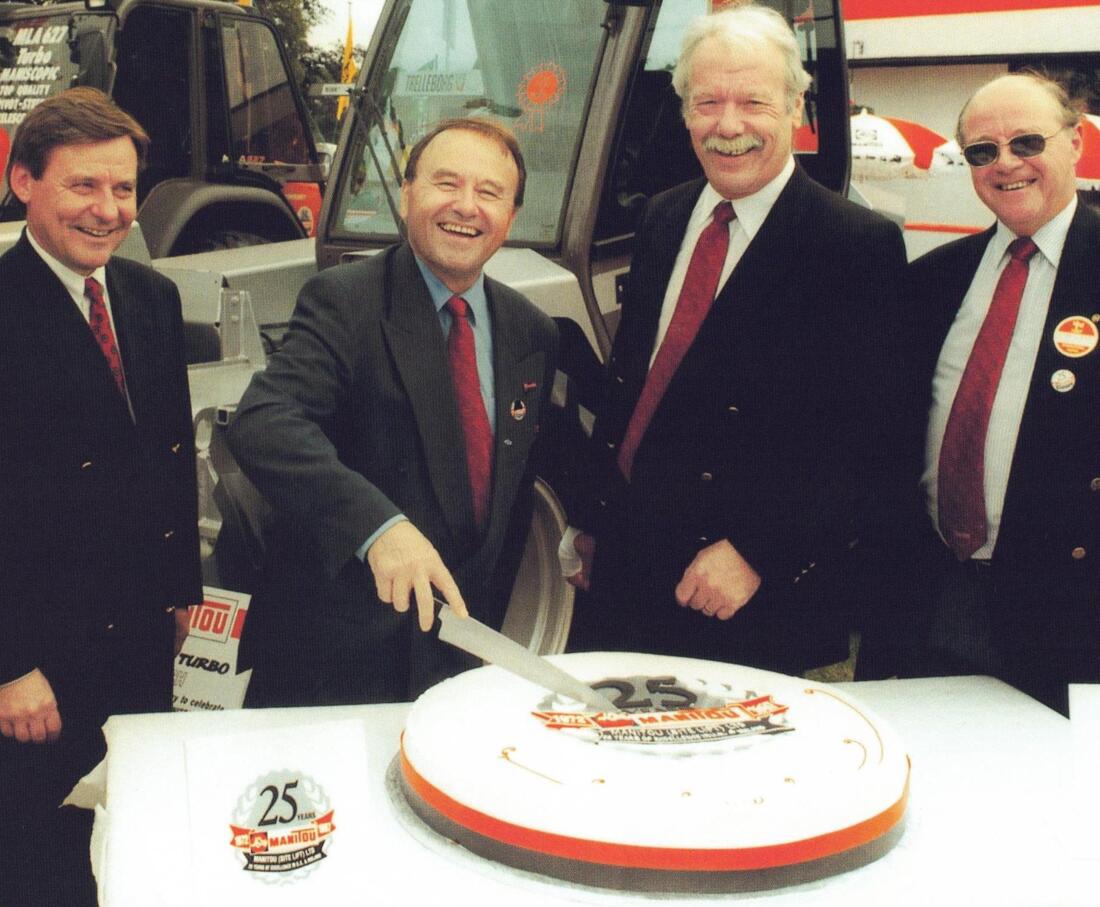 (L-R) Marcel Claude and Marcel Braud cut a cake on the 25th anniversary of Manitou UK in 1997 with John Walker and Gordon Himsworth .