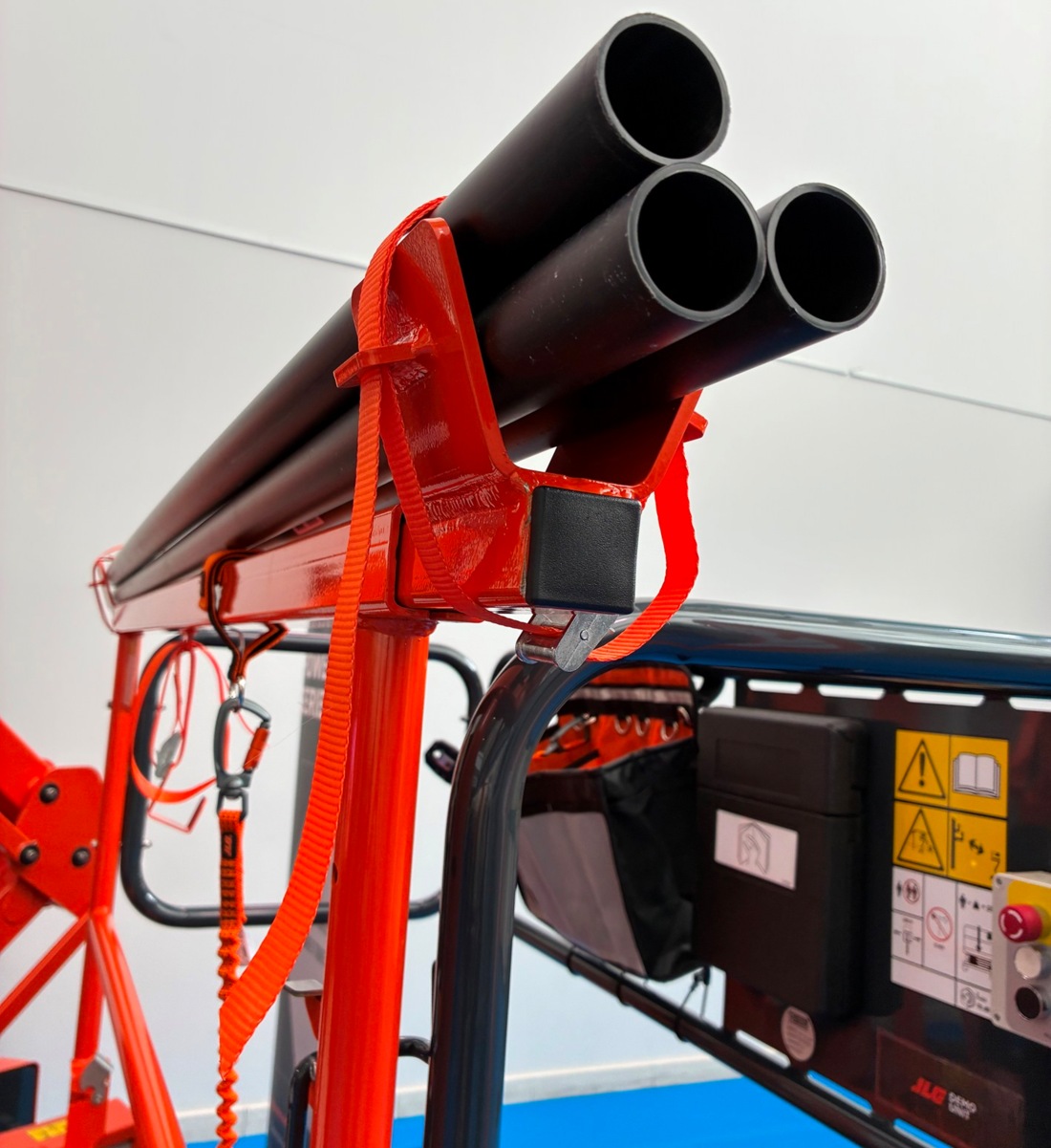 JLG’s small pipe carrier, with a tool pouch and lanyards in the background