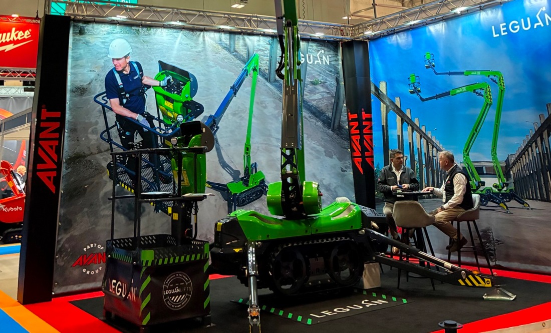 • Avant Tecno showed its latest spider lifts with the Leguan 135 Neo with 13.4 metres working height inside and the 19.5 metre Leguan 195 in the outside area of the show.