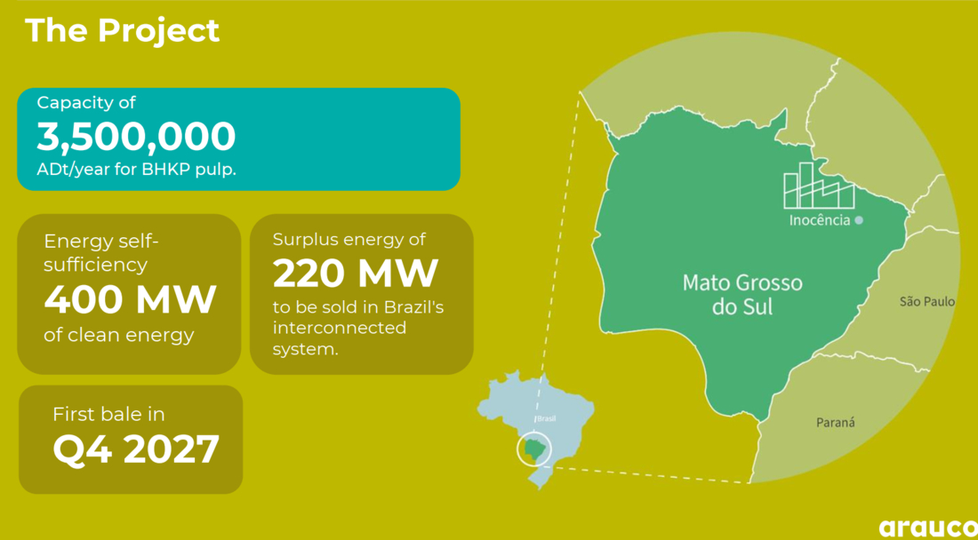 The $4.6 billion Arauco Sucuriú plant is located 50km from Inocência, Mato Grosso do Sul, and around 800km west of São Paulo. and will produce 3.5 million tonnes of short fibre pulp a year. and will be supplied by 400,000 hectares of sustainable eucalyptus plantations owned by Arauco.