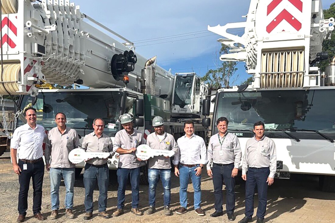 The handover of the LTM 1230-5.1 and LTM 1250-5.1 (L-R) Fabio Azevedo of Liebherr Brasil with Andre Luiz Cavalcanti Boechat, Ronaldo Sarcinelli, Elivane José de Souza and Welerson Roni Cavaglieri of Imetame with Rene Porto of Liebherr Brasil plus Gilson Pereira and Nilson Marin of Imetame .