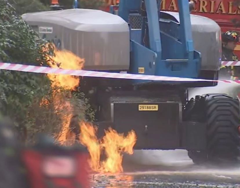 Thankfully, the man in the platform was not hurt, apart from his pride perhaps, but the contact caused the machine to catch fire, exacerbated by a fuel leak. Some reports suggested that the incident was caused by a car crashing into the lift, although it is hard to see how that could have been, given that it was working on the sidewalk, protected by trees and a line of parked cars. Another report suggests he drove into a power pole.