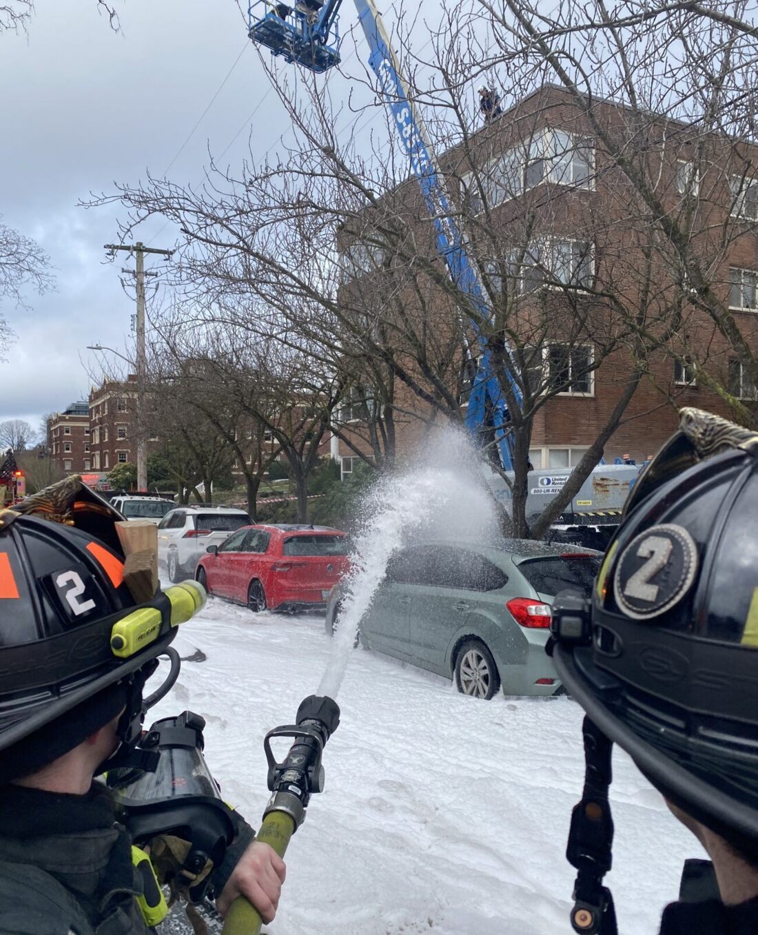 Firefighters used water and foam to extinguish the flames using a truck mount/bucket truck, Seattle City Light shut off electricity and Puget Sound Energy secured the natural gas line allowing the fire crew to use a fire ladder to bring the man down.