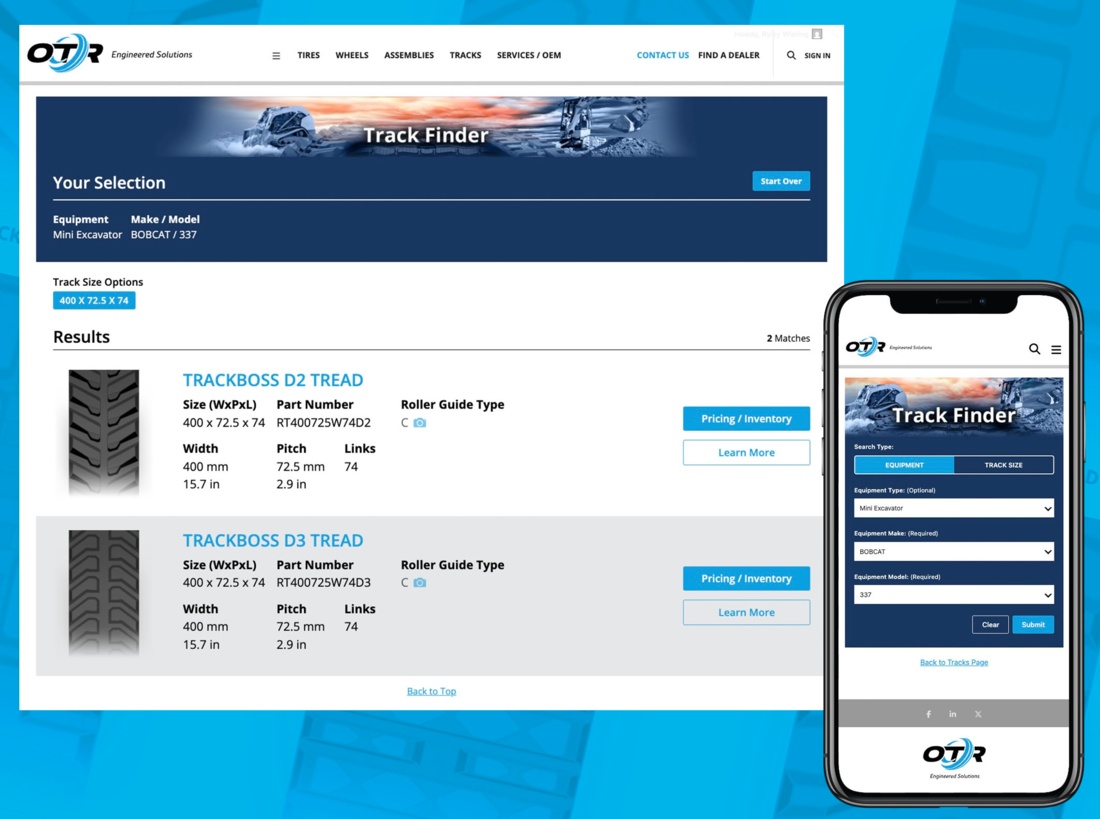 The new platform allows customers to search for tracks by tread pattern, size, or equipment make and model, with detailed information to help identify the most suitable options for their application.