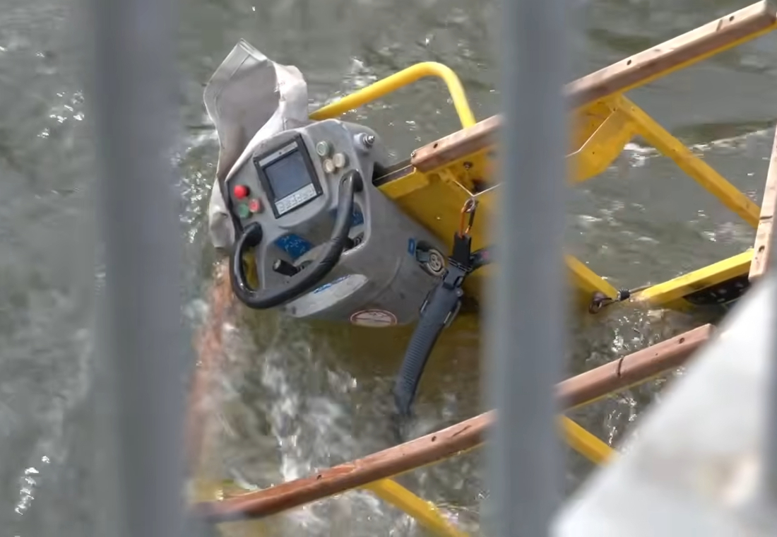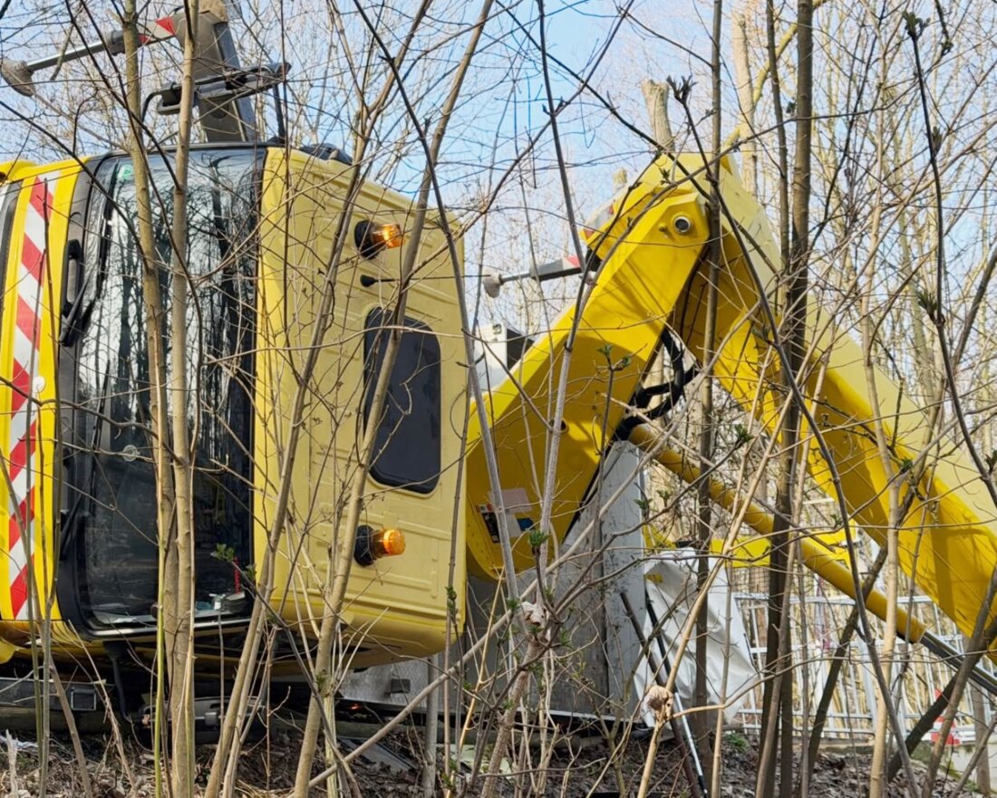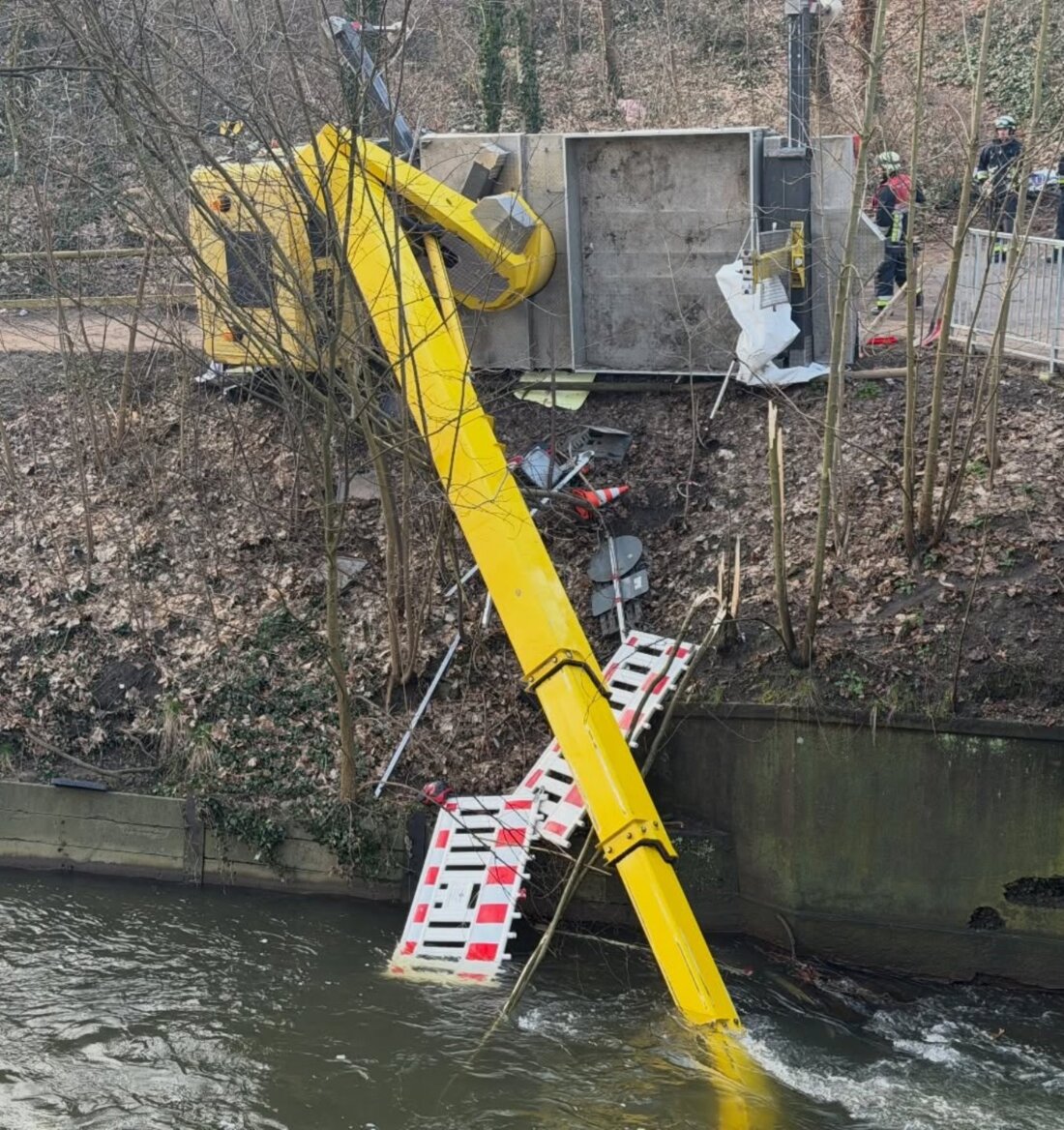 A truck mounted work platform overturned into the Pegnitz River in Nuremberg, Germany, earlier this month, dumping the operator into the freezing fast-flowing water.