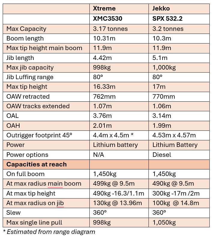 At the moment, we only have a basic and preliminary ANSI specification for the Xtreme crane, but it includes most of the details you might use to evaluate the crane. See the chart below. And given that a few Jekko loyalists, particularly in Germany, have been moaning that the Xtreme crane is a blatant copy of the Jekko SPX 532, we have run its specifications alongside, so that you can compare.