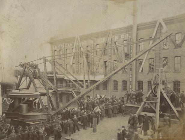 The American Hoist plant in 1895, with one of its first cranes