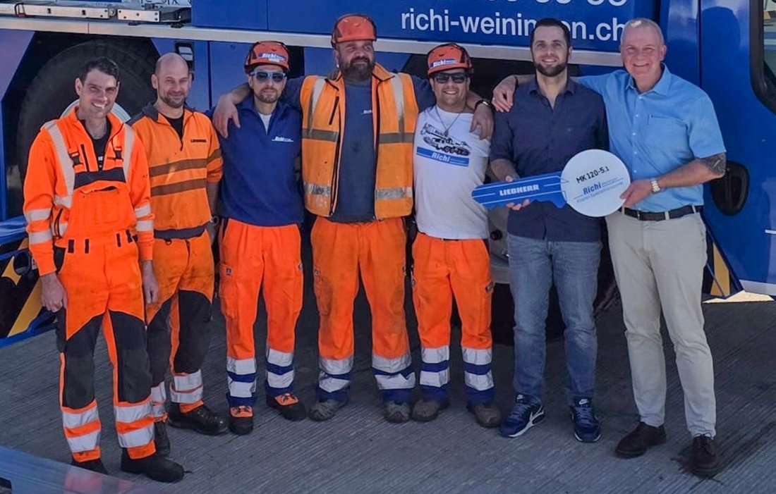 (L-R) Stefan Röthlisberger and Sascha Egli of Liebherr with Daniel Tomic, Thomas Ringo, Stefan Maike and Markus Fleck of Richi along with Marc Bollinger of Liebherr