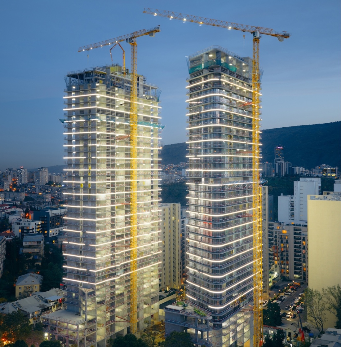 The cranes alongside the hotel development after dark