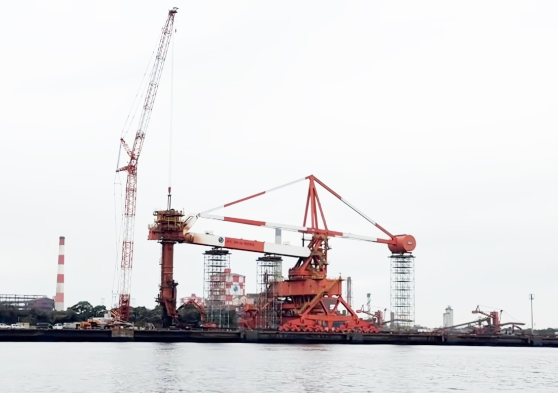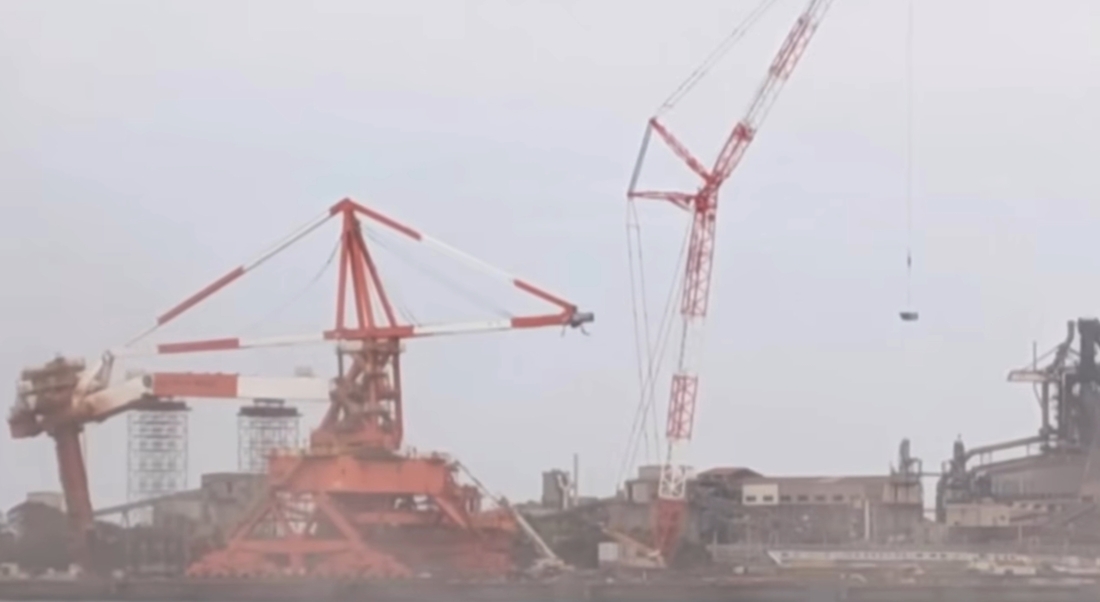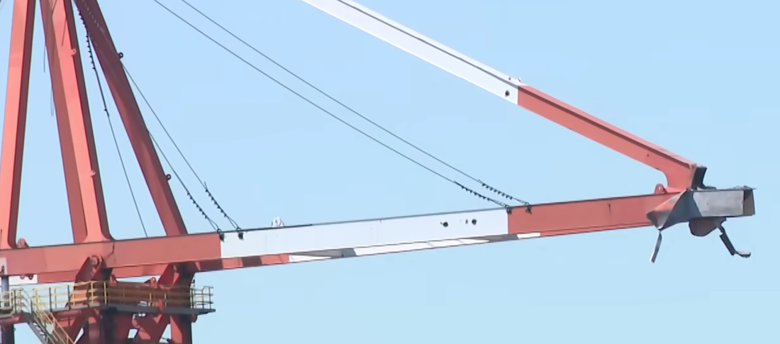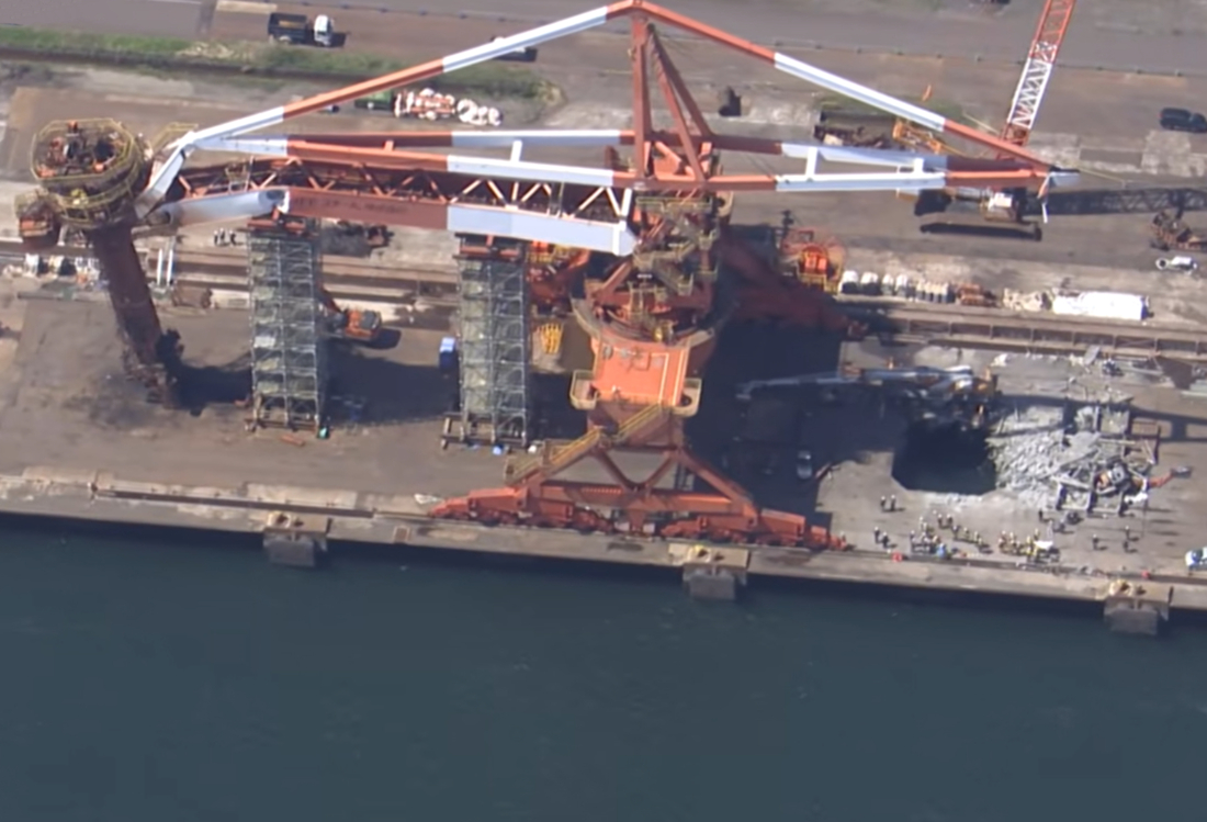 This incident occurred on Tuesday night, April 7th, when a crew were in the process of dismantling an old IHI dockside crane. A large 35 metre scaffold tower was supporting the counterweight, while additional towers supported the boom and front end.