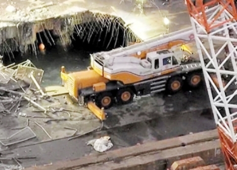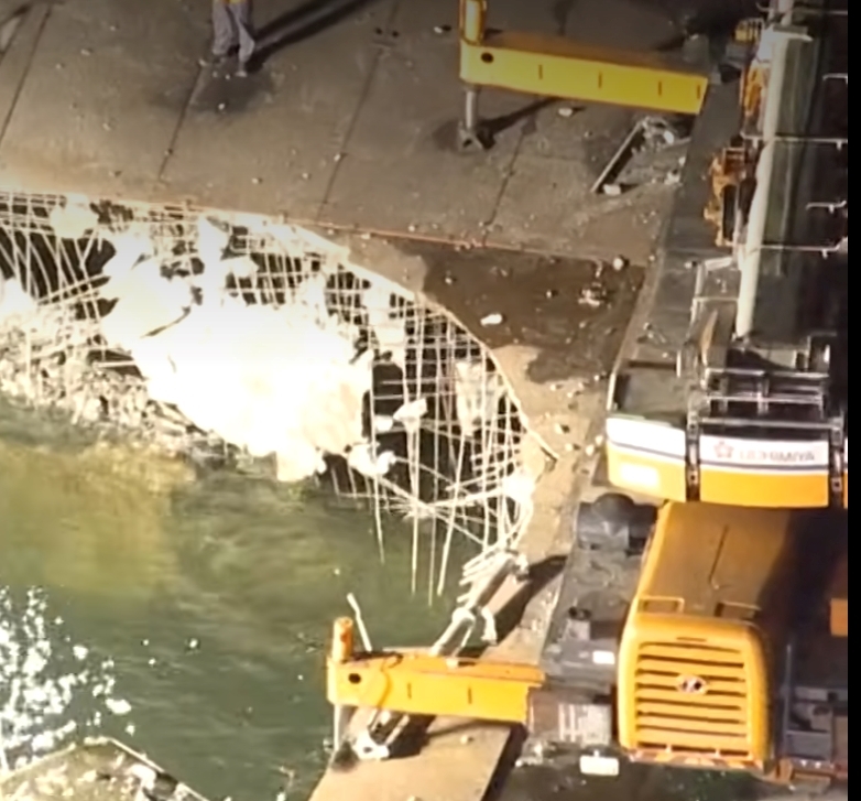 Either way, the counterweight plummeted 30 metres or more to the deck, smashing through it, and possibly taking some of those working below with it into the water. At least one excavator was overturned, while a four axle Rough Terrain /city crane had a very lucky escape.