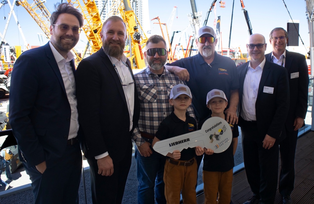 The handover at Conexpo last month - (L-R) Simon Schuster and Beau Pocock of Liebherr with Paul Prillaman junior and senior, along with Brian Peretin and Bret Jacobson of Liebherr. Out in front - Paul Junior's sons, Paul and Page Prillaman
