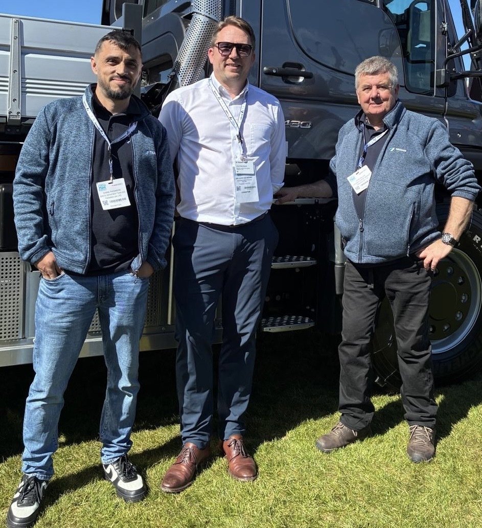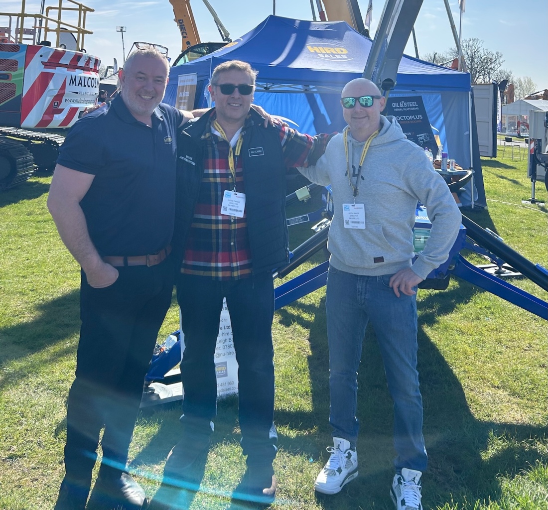 (L-R) Dan Holgate of Hird with David Cairns & Leigh Baker of Nu-Hire who purchased three Oil & Steel Octopus spider cranes during the show